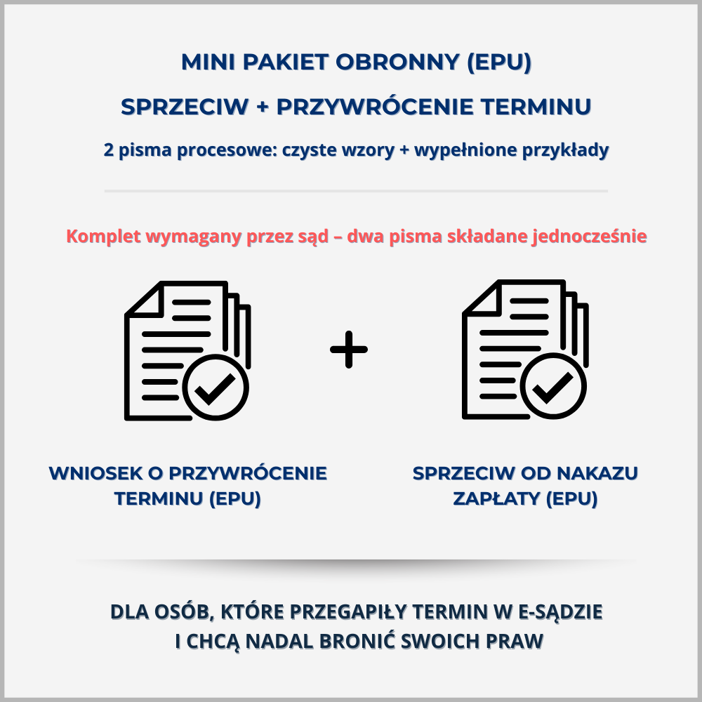 Mini Pakiet Obronny EPU to kompletny zestaw dwóch pism procesowych, które należy złożyć jednocześnie, gdy przegapiłeś termin na sprzeciw od nakazu zapłaty z e-Sądu.
