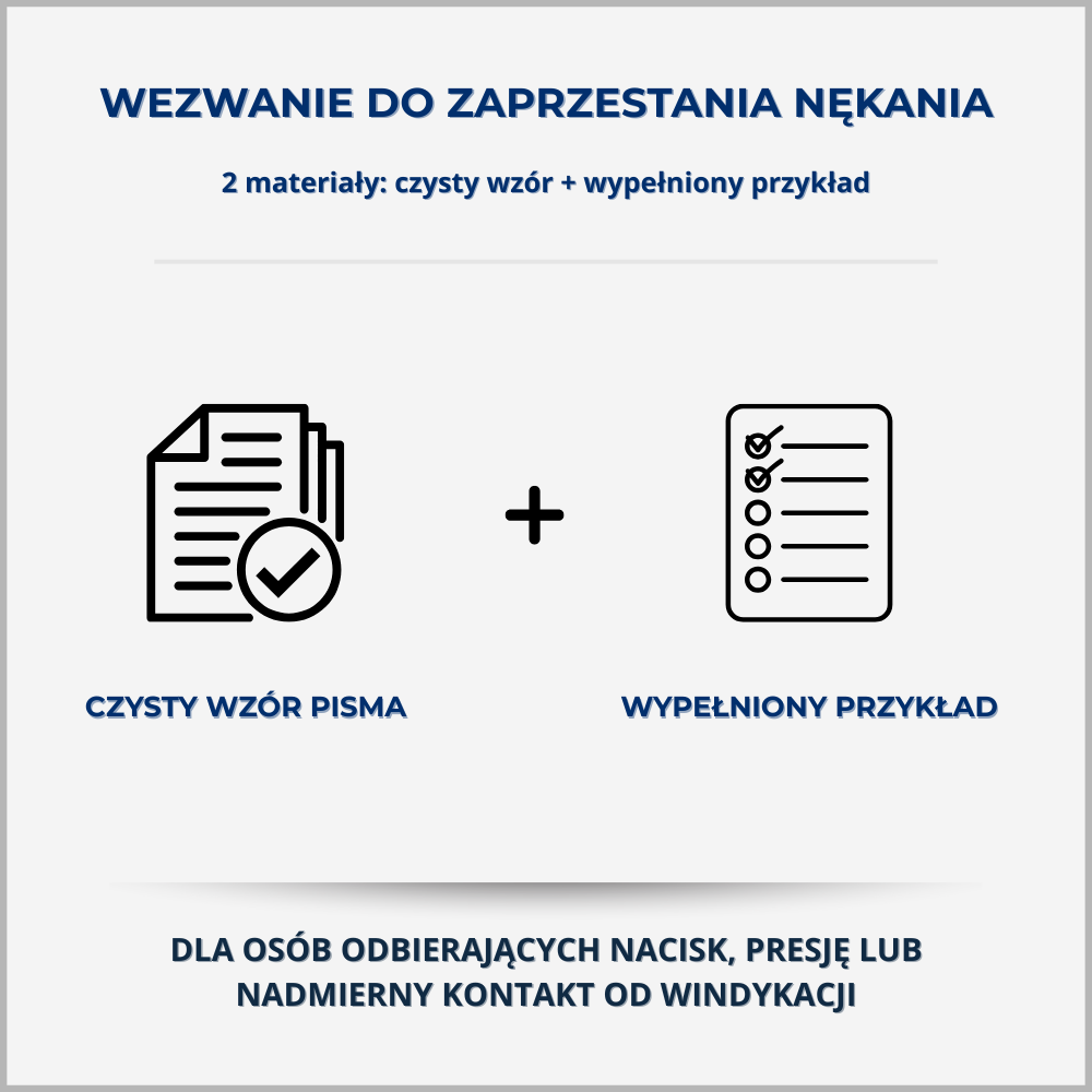 Profesjonalny wzór wezwania do zaprzestania nękania, kierowanego do firm windykacyjnych w przypadku nadmiernych telefonów, SMS-ów czy prób wywierania presji. Dokument w dwóch wersjach: czystej i przykładowo wypełnionej.